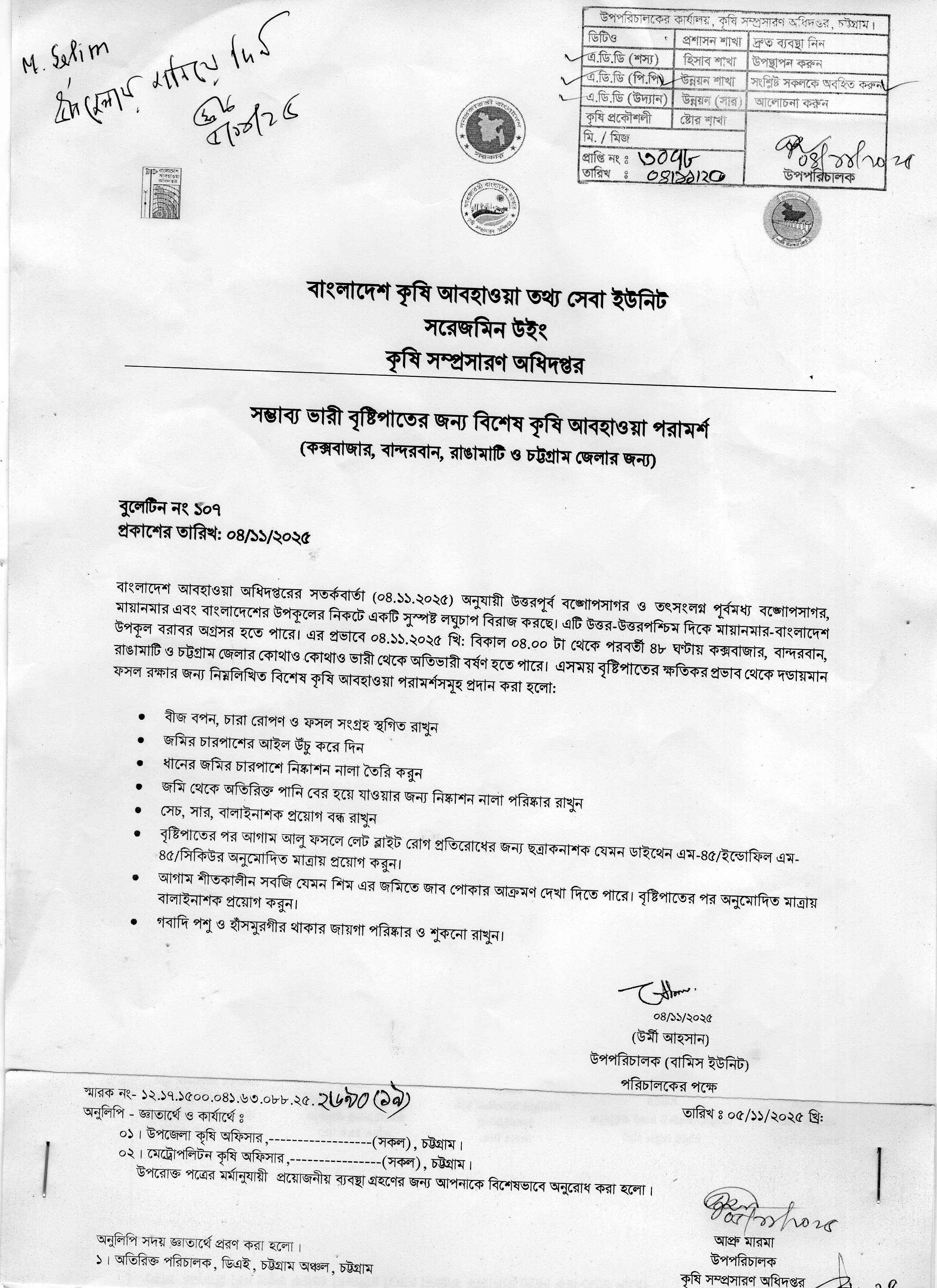 সম্ভাব্য ভারী বৃষ্টিপাতের জন্য বিশেষ কৃষি আবহাওয়া পরামর্শ